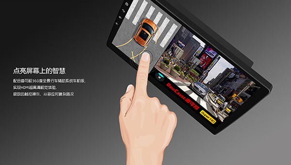 觸控——產(chǎn)品采用了10.1寸超大IPS屏幕以及G+G觸摸屏,可實(shí)現(xiàn)觸控操作;在觸控指令下,在行車過(guò)程中可根據(jù)車主自主需求,直接通過(guò)觸摸屏幕切換視角畫面, 無(wú)需再通過(guò)打轉(zhuǎn)向燈或是掛倒擋等來(lái)被動(dòng)切換視角畫面,除此之外,還可實(shí)現(xiàn)設(shè)置、記錄回放等眾多便捷操控,更智能、更便捷!