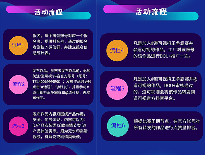流程4:凡是加入#道可視抖王爭霸賽并@道可視的作品,工廠對(duì)該賬號(hào)的該作品進(jìn)行DOU+推廣一次。