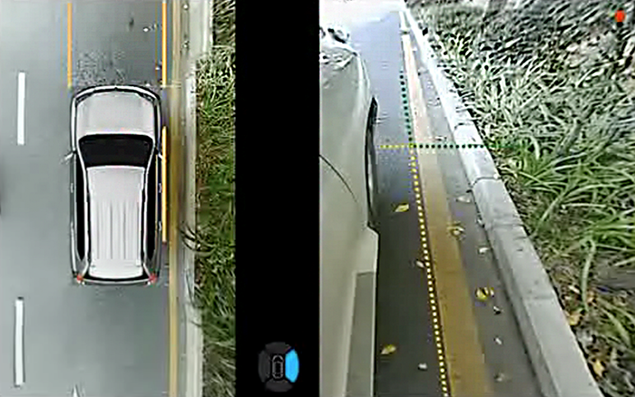 針對這一場景,道可視的“??柯费履J健痹诘管嚈n模式下開啟雙閃時,會將車身兩側(cè)(整個車身、前后輪、踏板等)同時顯示,以這種近場垂直的鳥瞰圖顯示方式,配合安全參考線(與車身距離為20CM),有效的解決了停靠路崖時可能對輪胎及輪轂造成刮傷的問題。